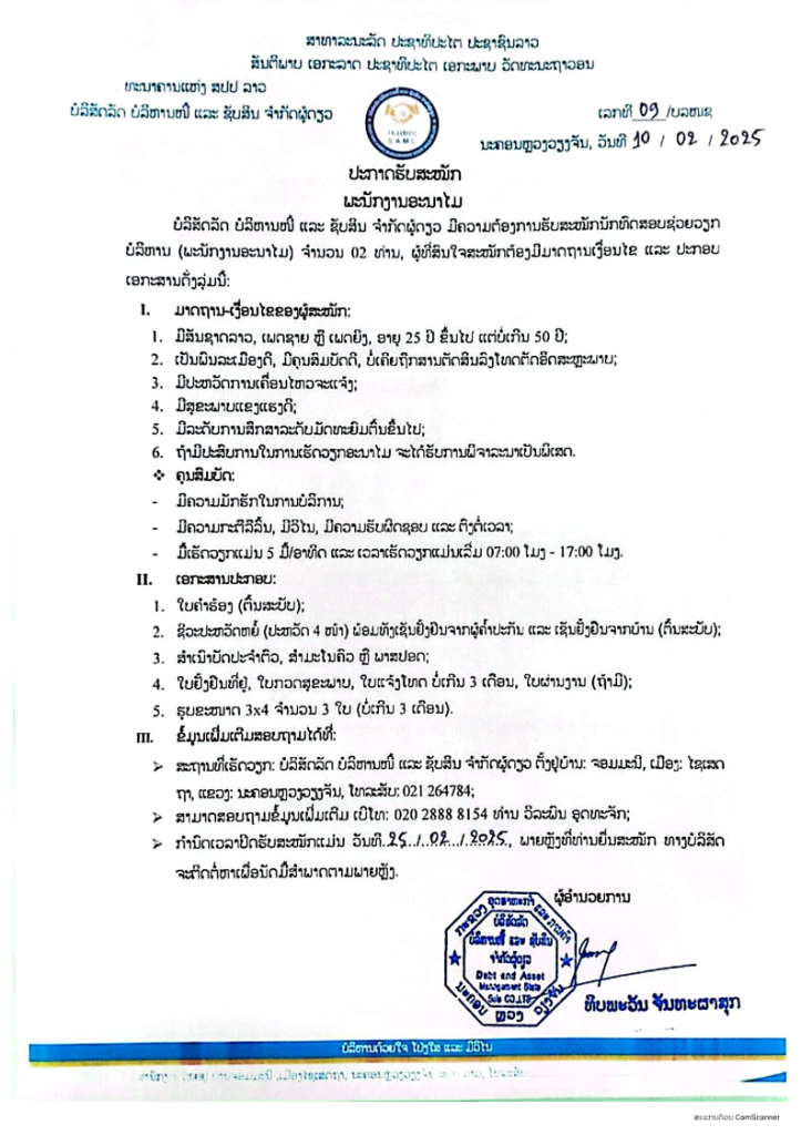 ປະກາດຮັບສະໝັກ ພະນັກງານອະນາໄມສະໝັກວຽກ By samc Last updated Mar 19, 2025 4 0 ລາຍລະອຽດເອກະສານDownload Job vacancy for cleaning staff 0 4 Share